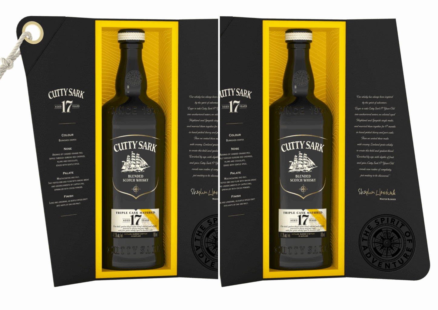 Le packaging répond à toutes les attentes avec un coffret de présentation noir percutant, orné de lettrage doré et du célèbre éclat jaune Cutty Sark, alliant luxe et forte reconnaissabilité.