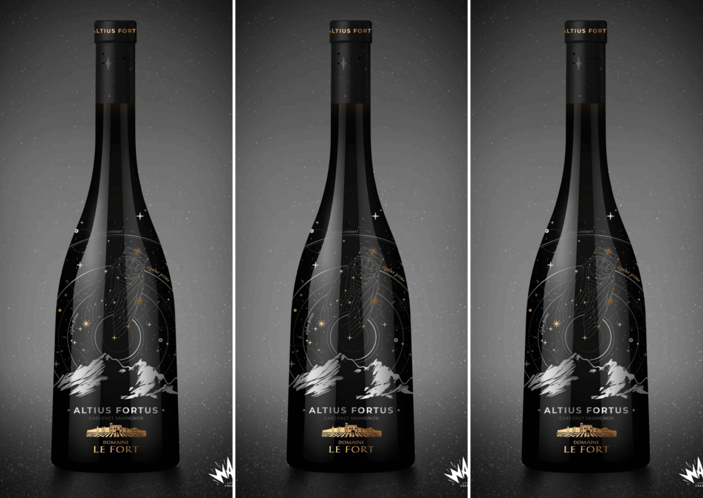En raison de la forme complexe de la bouteille et de ses diamètres variés, la gravure a nécessité sept passages d’impression. Les éléments dorés ont été réalisés en « hot stamping », ajoutant une contrainte supplémentaire. La précision des détails, notamment les étoiles dorées, renforce l’attrait esthétique de la bouteille.